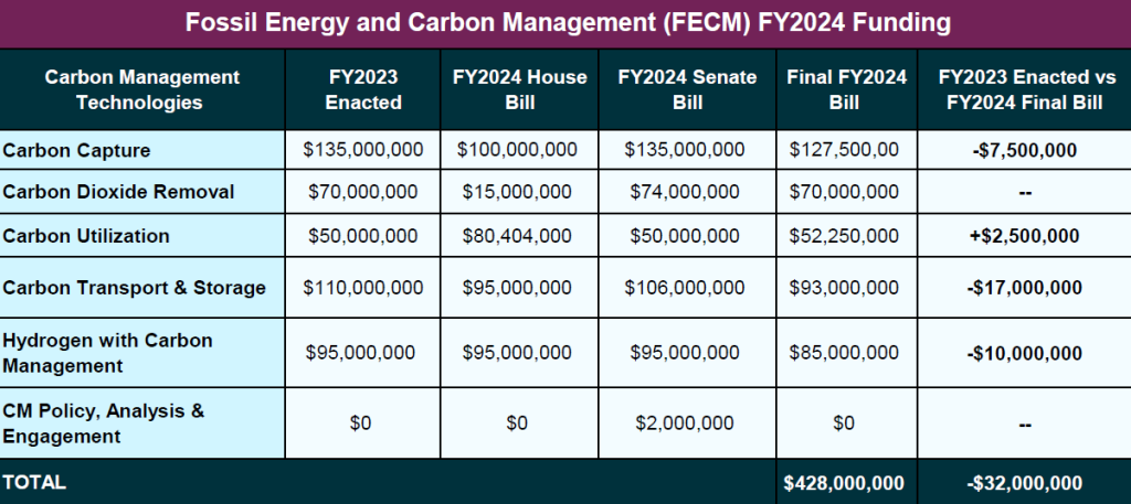 “Annual appropriations for core carbon management programs across government agencies represent a fundamental source of federal support for the research, development, and deployment (RD&D) of these technologies. We are disappointed to see that recent incremental gains made in foundational carbon management programs funded under the Department of Energy (DOE) have decreased by $32 million this funding cycle. Annual federal funding is critical for realizing necessary economies of scale for the full value chain of carbon management technologies (carbon capture, removal, reuse, transport, and storage) which are necessary to help mitigate the worst impacts of climate change while providing vital economic and health benefits to local communities and workers.