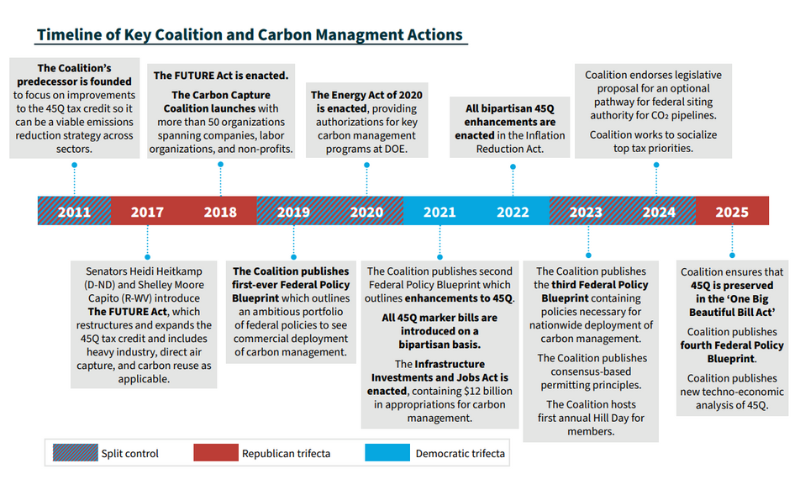 On July 4, 2025, President Trump signed the One Big Beautiful Bill Act (OBBBA) into law. The package took a varied approach to modifying energy tax credits, with many tax credits seeing significant changes that could dramatically impact the deployment trajectory of many clean energy technologies. Despite these changes, notably, the federal Section 45Q tax credit was preserved in full and even slightly enhanced—an outcome that could not have been achieved without the strong and coordinated efforts of the Coalition, our members, and the wider carbon management advocacy community.