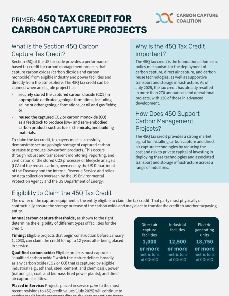 The federal section 45Q tax credit gives financial incentives for projects that capture carbon, whether from industrial sources, power generation, or directly from the atmosphere, and either store it securely underground or reuse it in low‑carbon products. Updated rates offer $85/ton for industrial/power capture or reuse, and $180/ton for direct air capture, with eligibility expanding via lower annual capture thresholds. Additional features like credit transferability, prevailing wage/apprenticeship requirements, and a construction deadline help provide certainty, fairness, and broader access. Check the full primer to understand the full scope of rules, thresholds, and opportunities under Section 45Q.