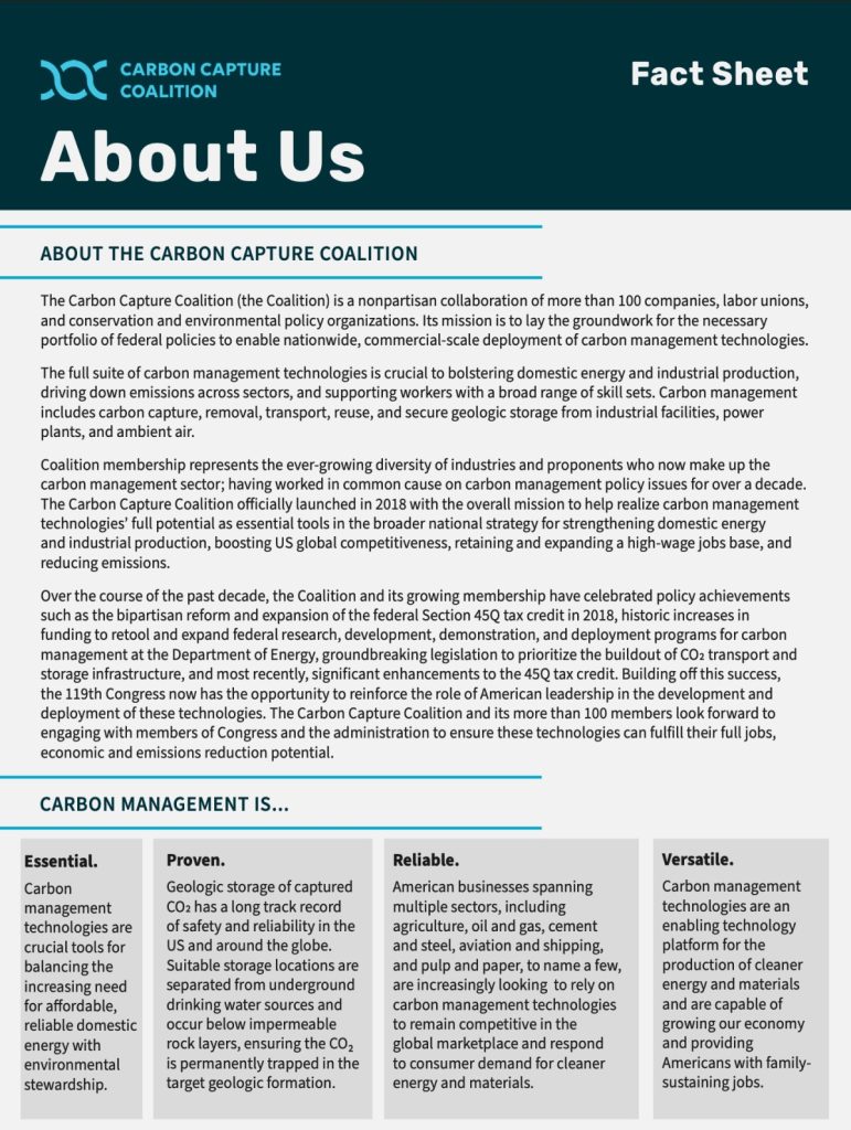 The Carbon Capture Coalition is a bipartisan network advancing policies to scale carbon management technologies and infrastructure across the U.S. Learn more about our mission, membership, and impact in the full fact sheet.