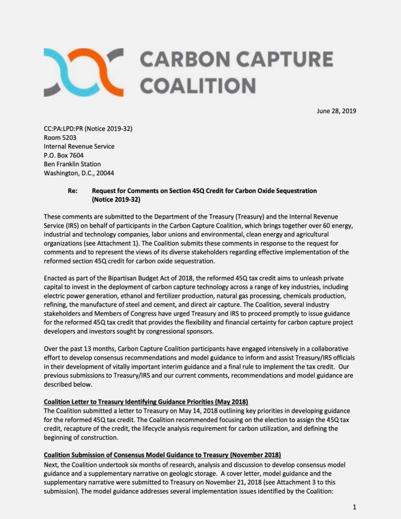 Read the Coalition’s comments, which were submitted to the Department of the Treasury and the Internal Revenue Service on behalf of participants in the Carbon Capture Coalition. The Coalition submits these comments in response to the request for comments and to represent the views of its diverse stakeholders regarding the effective implementation of the reformed section 45Q credit for carbon oxide sequestration.