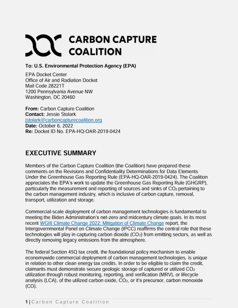 Read the Carbon Capture Coalition’s comments on the Revisions and Confidentiality Determinations for Data Elements Under the Greenhouse Gas Reporting Rule (EPA-HQ-OAR-2019-0424).