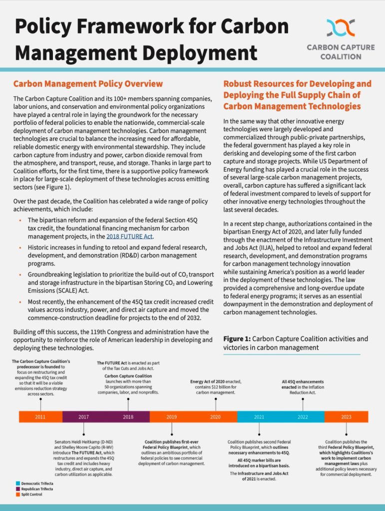 The policy framework of the Carbon Capture Coalition highlights landmark achievements, including the bipartisan expansion of the Section 45Q tax credit, boosted funding for research and demonstration programs via the Energy Act of 2020 and the Infrastructure Investment and Jobs Act (IIJA), and support for CO₂ transport and storage through the SCALE Act. These policies collectively aim to de-risk and catalyze the build-out of carbon capture, utilization, removal, and secure storage infrastructure nationwide. Read the full document to explore how these integrated strategies could unlock the commercialization of carbon management deployment.